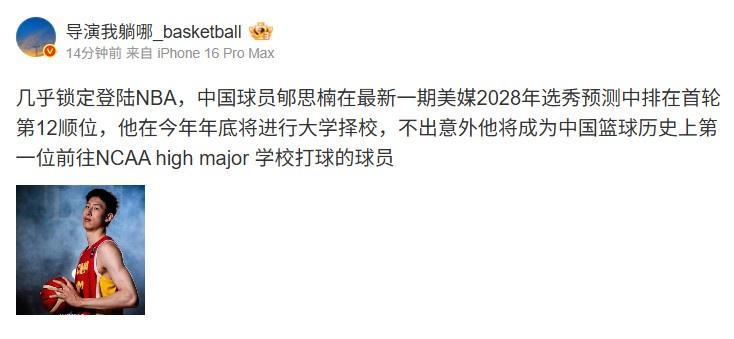 对此,媒体人导演我躺哪写道:“几乎锁定登陆NBA,中国球员郇斯楠在最新一期美媒2028年选秀预测中排在首轮第12顺位,他在今年年底将进行大学择校,不出意外他将成为中国篮球历史上第一位前往NCAA high major学校打球的球员。”