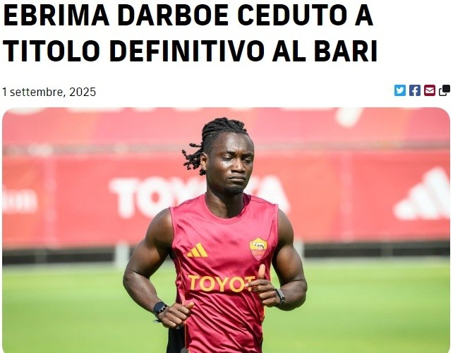9月2日,罗马足球俱乐部官方确认,青训体系中场球员达尔伯正式转会至意乙俱乐部巴里。